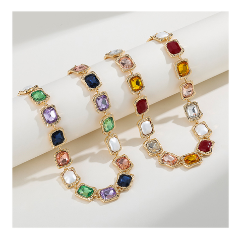 Kj Original Design Statement Necklace Luxury 18k Gold Colorful Square Crystal Glass Rhinestone Choker Necklaces for Women